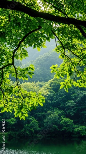 © Purichaya, Obraz premium A tranquil landscape featuring lush green leaves and a serene lake, perfect for nature and relaxation themes.