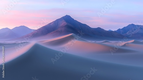 Fototapeta premium A tranquil landscape showcasing rolling sand dunes under a pastel sky, with distant mountains illuminated by soft morning light, evoking a serene and dreamy atmosphere.