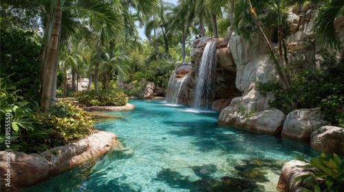 Naklejka premium A tranquil moment in a beautiful tropical setting with a stunning waterfall...