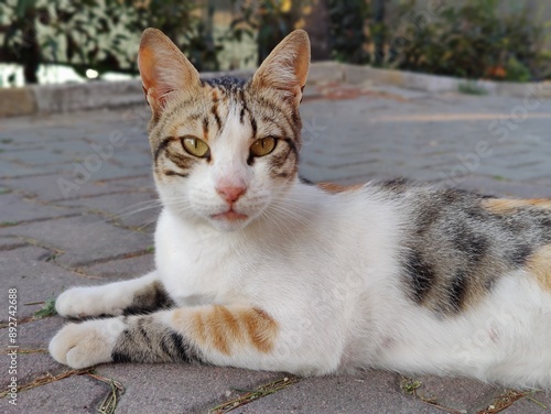 Naklejka premium A Tranquil Moment: The Grace and Serenity of a Calico Cat, a Silent Guardian of Urban Mysteries