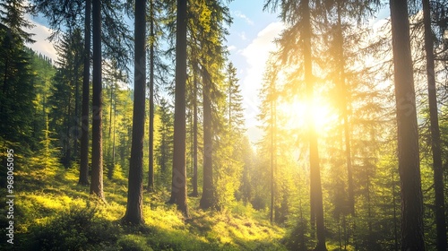 Fototapeta premium A tranquil mountain forest with tall pine trees, dappled sunlight filtering...