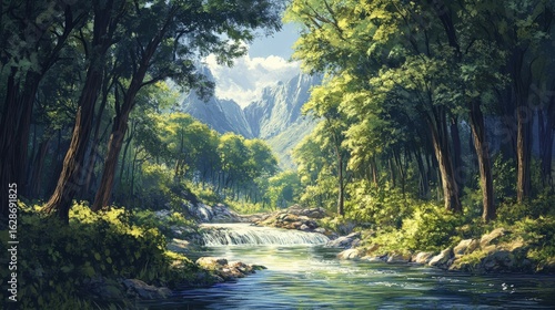 © Sobah, Obraz premium A tranquil mountain stream flowing through a lush forest.