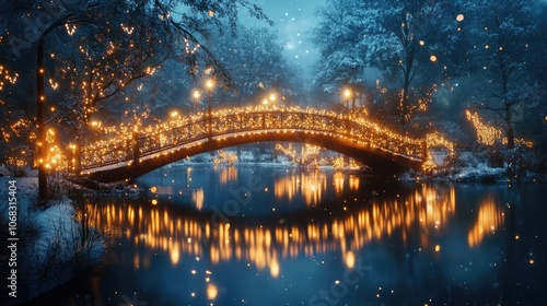 © Timeless Touch, Obraz premium A tranquil night scene featuring a bridge illuminated by ethereal lights, creating a dreamy Christmas atmosphere.