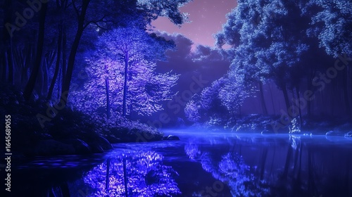 © Handz, Obraz premium A tranquil nighttime forest scene with water reflections and trees
