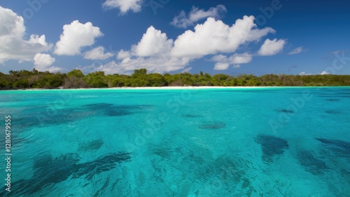 © StockKing, Obraz premium A tranquil ocean view showcasing crystal clear turquoise waters reflecting a vibrant blue sky with fluffy white clouds and lush green coastline.