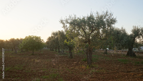 Obraz premium A tranquil olive grove in puglia, italy, featuring old, twisted olive trees olea europaea at sunset, set in a rural, mediterranean landscape with earthy tones and scattered sunrays.