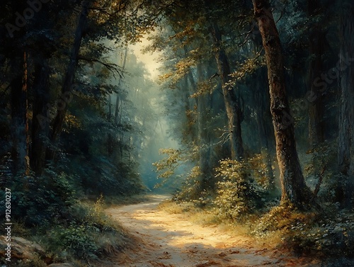 Naklejka premium A tranquil path meanders through dense trees, illuminated by soft afternoon...