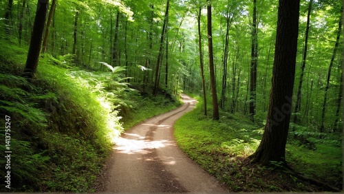 © Kasivat, Fototapeta premium A Tranquil Path Through Emerald Woods: Exploring Nature's Serenity Along a Winding Forest Trail.