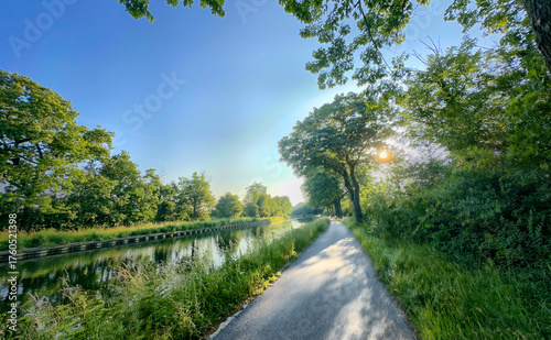 © Bjorn B, Obraz premium A tranquil pathway nestled beside a calm waterway under a clear blue sky, perfect for a peaceful stroll.