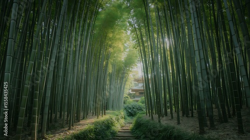 © Mr..Green, Obraz premium A tranquil pathway through a dense bamboo forest, bathed in sunlight.