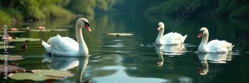 Fototapeta premium A tranquil pond with water lilies and a few swans gliding peacefully on the surface, swans, reflection