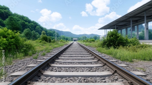 © julio, Fototapeta premium A tranquil railway track stretching through lush greenery and hills.