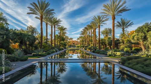 © BozStock, Fototapeta premium A tranquil reflection pool with palm trees lining the path.