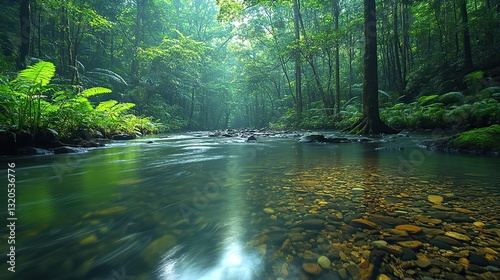 © Sang, Obraz premium A tranquil river, meandering gently through a dense, vibrant green rainforest, creates a serene, beautiful landscape.