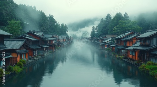 Naklejka premium A tranquil river runs through a picturesque mountain village,