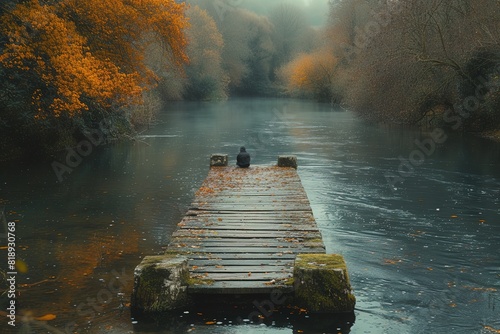 © create, Naklejka premium A tranquil riverbank scene with a wooden pier stretching into the water, a lone fisherman patiently waiting for a catch