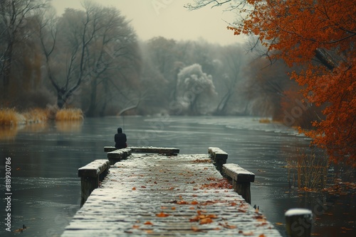 © create, Naklejka premium A tranquil riverbank scene with a wooden pier stretching into the water, a lone fisherman patiently waiting for a catch