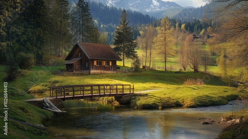 Fototapeta premium A tranquil riverside scene in Switzerland, featuring a charming wooden cabin surrounded by vibrant spring foliage and mountains. Generative AI
