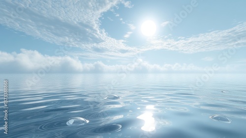 Obraz premium A tranquil scene featuring a serene ocean under a bright sun, with gentle waves and clouds reflecting a peaceful atmosphere.