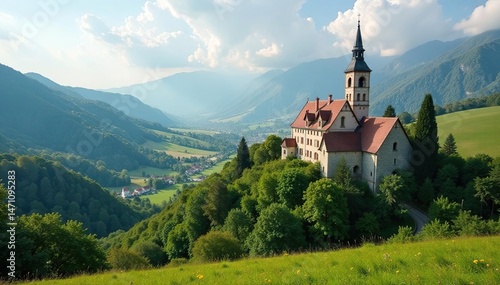 Fototapeta premium A tranquil scene of a Benedictine monastery nestled amongst rolling hills ,...
