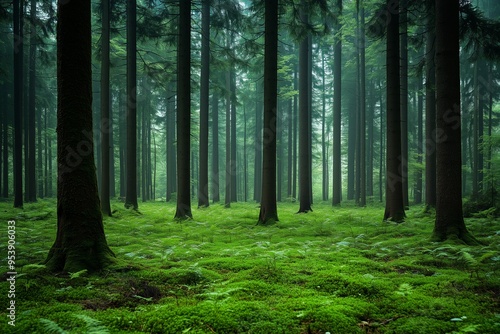 Obraz premium A tranquil scene of a dense forest shrouded in a light mist, creating an...