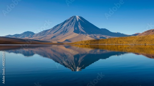 Naklejka premium A tranquil scene of a volcano reflecting in a serene lake, with the surrounding mountains mirrored in the still water.