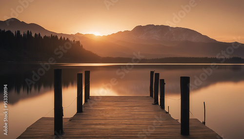 © vanAmsen, Fototapeta premium A tranquil scene of a wooden pier extending into a calm lake during the golden hour. The sky is abla
