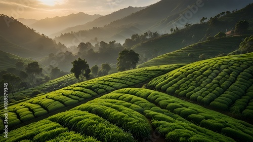 Obraz premium A tranquil scene of expansive tea fields with bright green foliage, the...