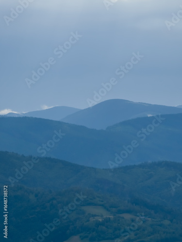Fototapeta premium A tranquil scene of layered misty mountains and dense forests, perfect for...