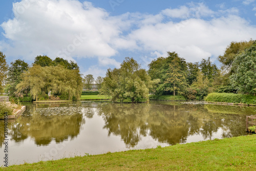 © Casa imágenes, Fototapeta premium A tranquil scene showcasing lush green trees surrounding a calm pond under a bright blue sky, reflecting nature's beauty in a peaceful environment.