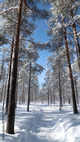 Fototapeta premium A tranquil scene with two bare trees surrounded by snow, set against a bright...