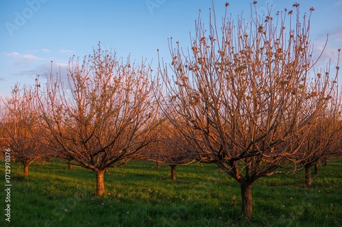 Obraz premium A tranquil snowy orchard bathed in warm sunlight, radiating calm and minimalism.