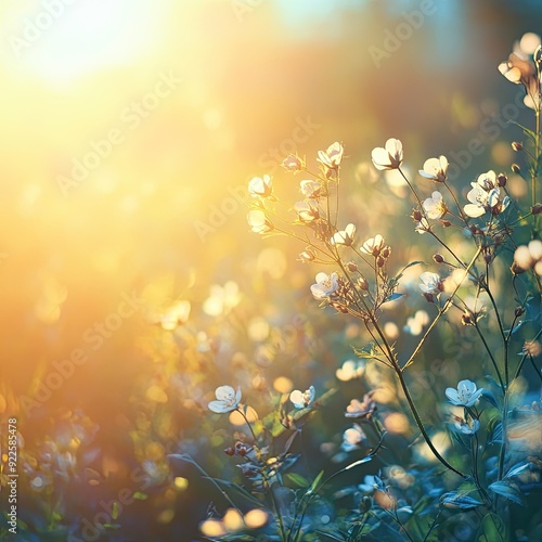 © Theeranan, Fototapeta premium A tranquil spring background featuring blooming flowers bathed in soft sunlight, symbolizing growth and new beginnings