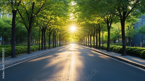 © Kankamol Tama, Fototapeta premium A tranquil street lined with trees, sunlight softly illuminating the path and leaves, urban sunlight, city-nature harmony
