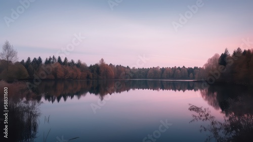 Fototapeta premium A tranquil sunset over a lake surrounded by trees with pastel hues of pink...