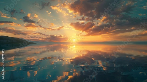 © Watanabe, Obraz premium A tranquil sunset over a serene lake with the sky reflecting in the still water.