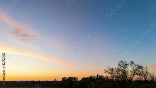Obraz premium A tranquil sunset view over a rural landscape, showcasing vibrant colors in the sky at dusk, with silhouettes of trees framing the scene, ideal for nature-inspired themes.