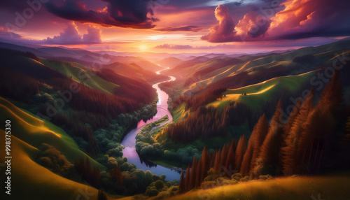 © Piya, Fototapeta premium A tranquil sunset vista where the sun kisses the horizon, illuminating the river and hills.