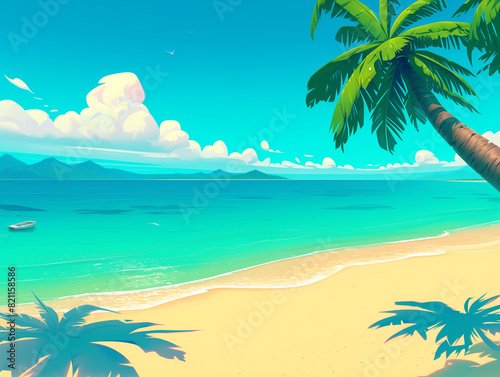 Fototapeta premium A tranquil tropical beach scene featuring a pristine sandy shore, clear turquoise waters, and a solitary boat floating nearby. Tall palm trees frame the foreground