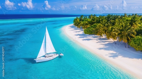 © Dounonji, Obraz premium A tranquil tropical scene featuring a sailboat cruising through clear blue waters with a sandy beach and lush palm trees in the background.