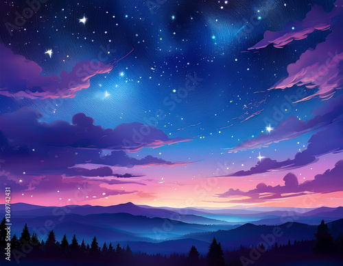 © Vitali, Fototapeta premium A tranquil twilight sky transitioning between blue and deep purple with scattered stars beginning to emerge.