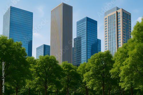 © JAMAL PRODUCTION, Obraz premium A tranquil urban oasis featuring a vibrant green park with a backdrop of modern downtown skyscrapers under a clear blue sky.