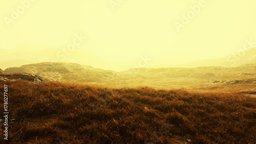 Obraz premium A tranquil valley stretches out under a golden haze, with soft grass swaying gently. Faint mountains rise in the background, creating a peaceful atmosphere at dawns early light.