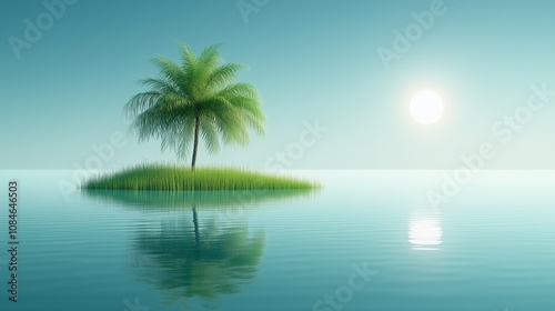 © Peeradontax, Fototapeta premium A tranquil vector illustration of a small tropical island featuring a lush green palm tree surrounded by calm turquoise waters.