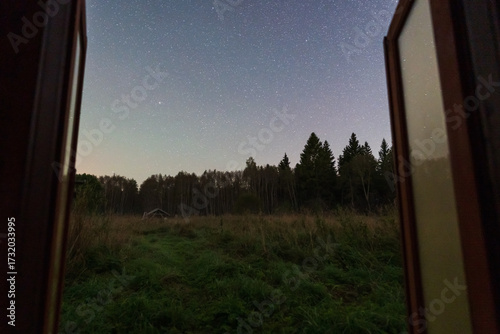 Fototapeta premium A tranquil view from an open door, overlooking a grassy field and the starry...