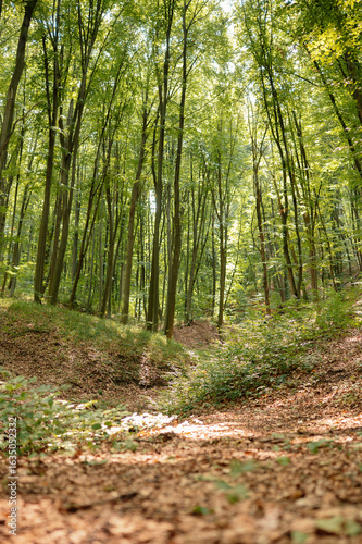 Fototapeta premium A tranquil view of a winding forest path, showcasing vibrant green trees and sunlight filtering through