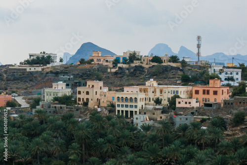 Naklejka premium A tranquil village in Oman nestled among hills and palm trees under a cloudy sky