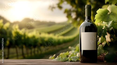 Fototapeta premium A tranquil vineyard scene with a wine bottle amidst lush greenery