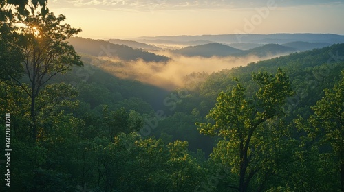 Fototapeta premium A tranquil vista of rolling hills blanketed by a soft morning mist, bathed in...