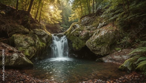 Fototapeta premium A tranquil waterfall cascading down mossy rocks in a sun-drenched forest,...